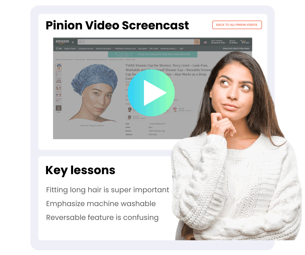 Pinion Videos™ are screencast recordings of Amazon shoppers interacting with your listing as they think out loud.